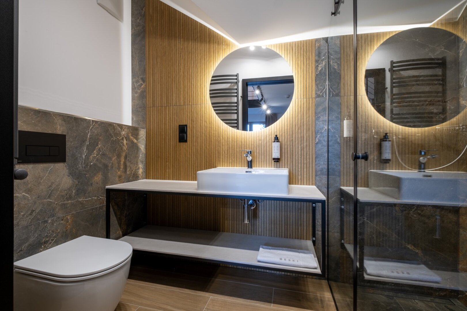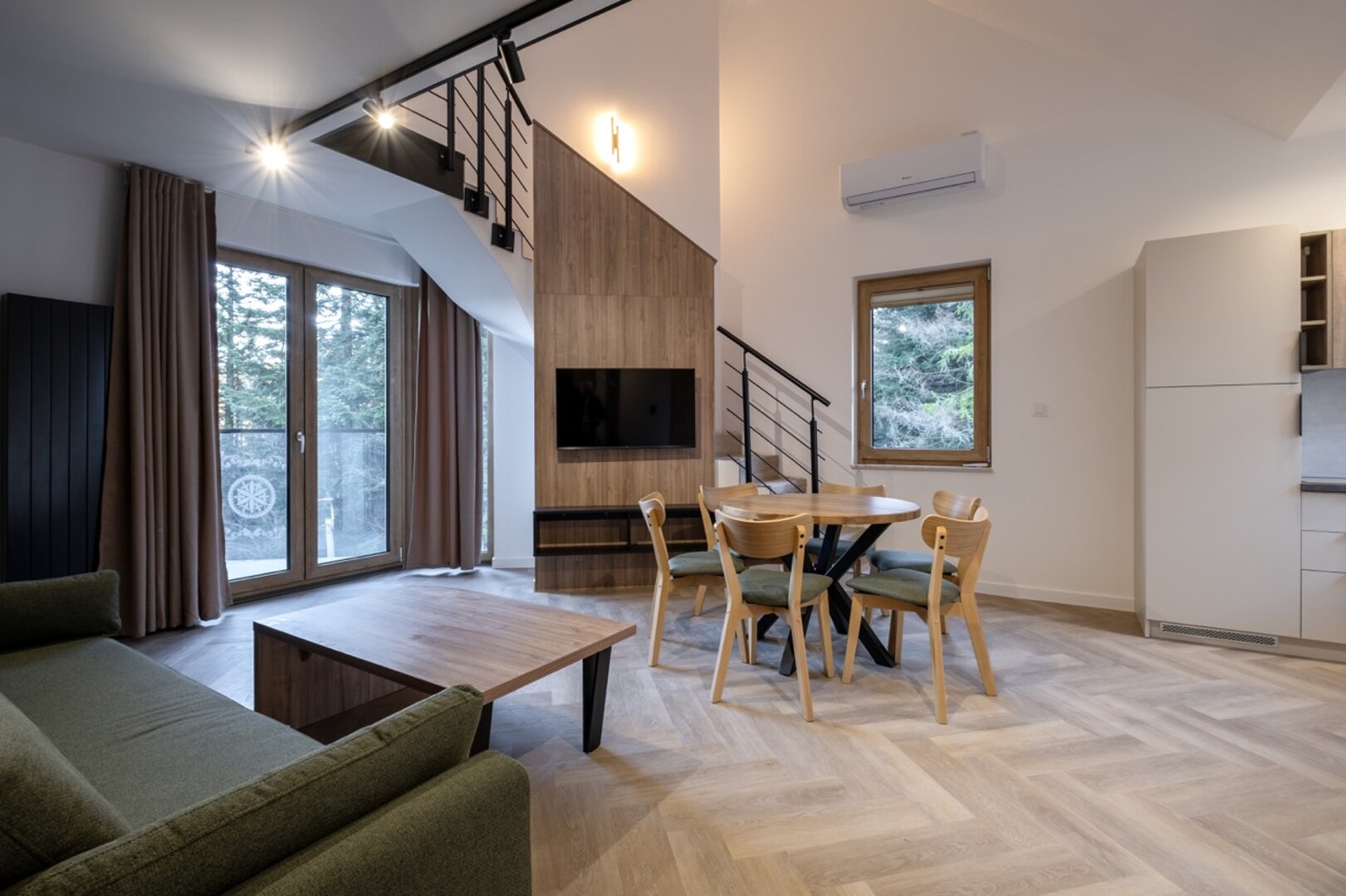 Przestronny apartament z antresolą, idealny dla większych grup. Oferuje komfortowe sypialnie oraz przytulny salon z rozkładaną kanapą.